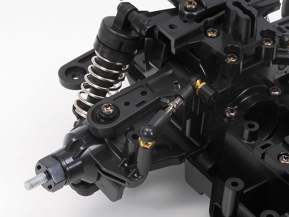 【 基本スペック 】 ●全長404mm、全幅187mm、全高155mm ●ホイールベース257mm(スタンダード)●トレッド 前後とも157mm ●タイヤ幅/径=前後とも27mm/67mm ●フレーム=バスタブタイプ ●駆動方式=前輪駆動 ●デフギヤ=樹脂製4ベベルタイプ ●ステアリング=3分割タイロッド式 ●サスペンション=4輪ダブルウィッシュボーン ●ダンパー=前後ともフリクション ●ギヤ比=8.27:1(キット標準22Tピニオン使用時) ●モーター=540タイプ ●スピードコントローラー=ESC仕様(別売)