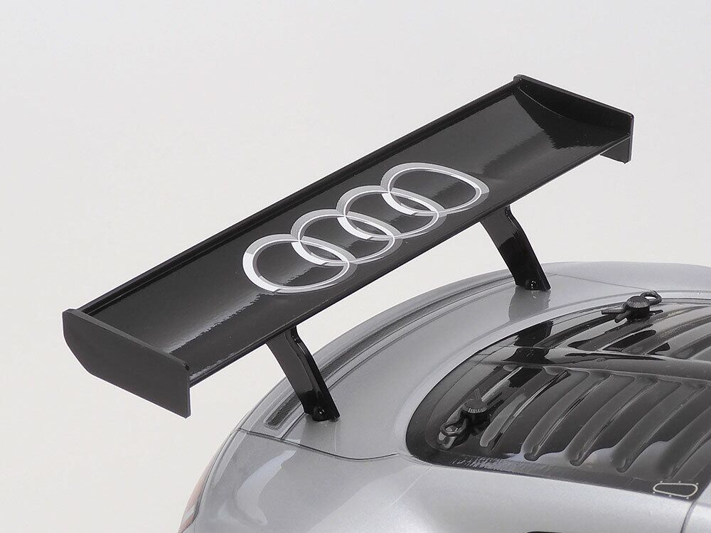 大型リヤウイングは樹脂製の別パーツ。アウディのエンブレムはステッカーで用意。