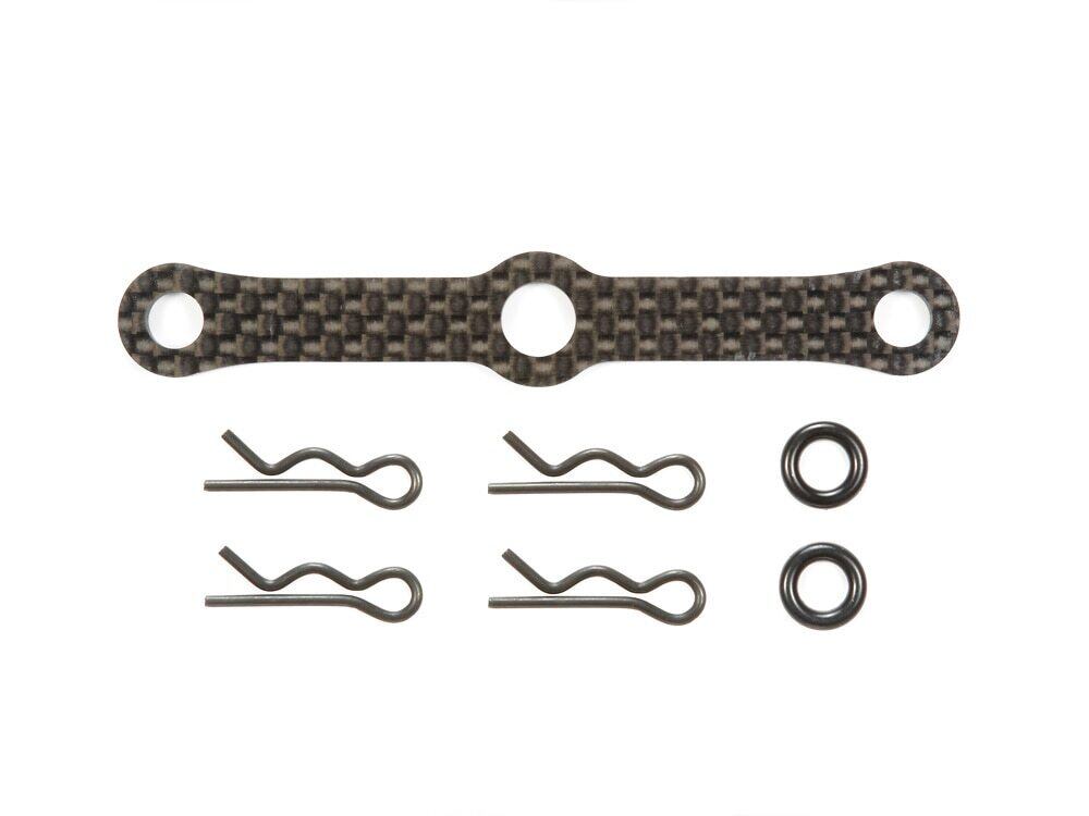 長いボディマウント使用するボディが多いMシャーシ。そのボディマウントの剛性を上げる2.5mm厚のカーボン製メンバー。走行中のボディのブレを軽減します。