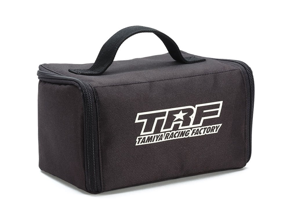 40ccのシリコンオイルボトル14~15本が収納できる布製バッグです。オイルボトルはもちろん、他の細かなパーツの収納バッグとしても便利に使えます。スライダーが2個付いて正面が大きく開くので、モノの出し入れもスムーズ。色はシックなブラック。TRFロゴとタミヤマークをグレイで印刷しました。