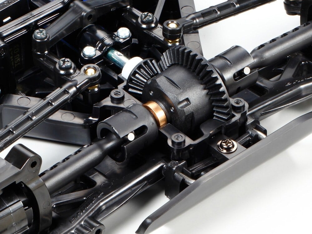 【 基本スペック 】 ●全長380mm、全幅250mm、全高145mm ●ホイールベース 266mm ●トレッド=フロント217mm、リヤ208mm ●フレーム=バスタブタイプ ●駆動方式=シャフトドライブ4WD ●デフギヤ=前後とも4ベベルデフ ●ステアリング=3分割タイロッド式 ●サスペンション=4輪ダブルウィッシュボーン ●タイヤ幅/径=フロント32/82mm、リヤ41/82mm(スクエアスパイク) ●ダンパー=CVAオイルダンパー ●ギヤ比=10.71:1 (キット付属ピニオンギヤ) ●540タイプモーター付き ●スピードコントローラー=ESC仕様(別売)