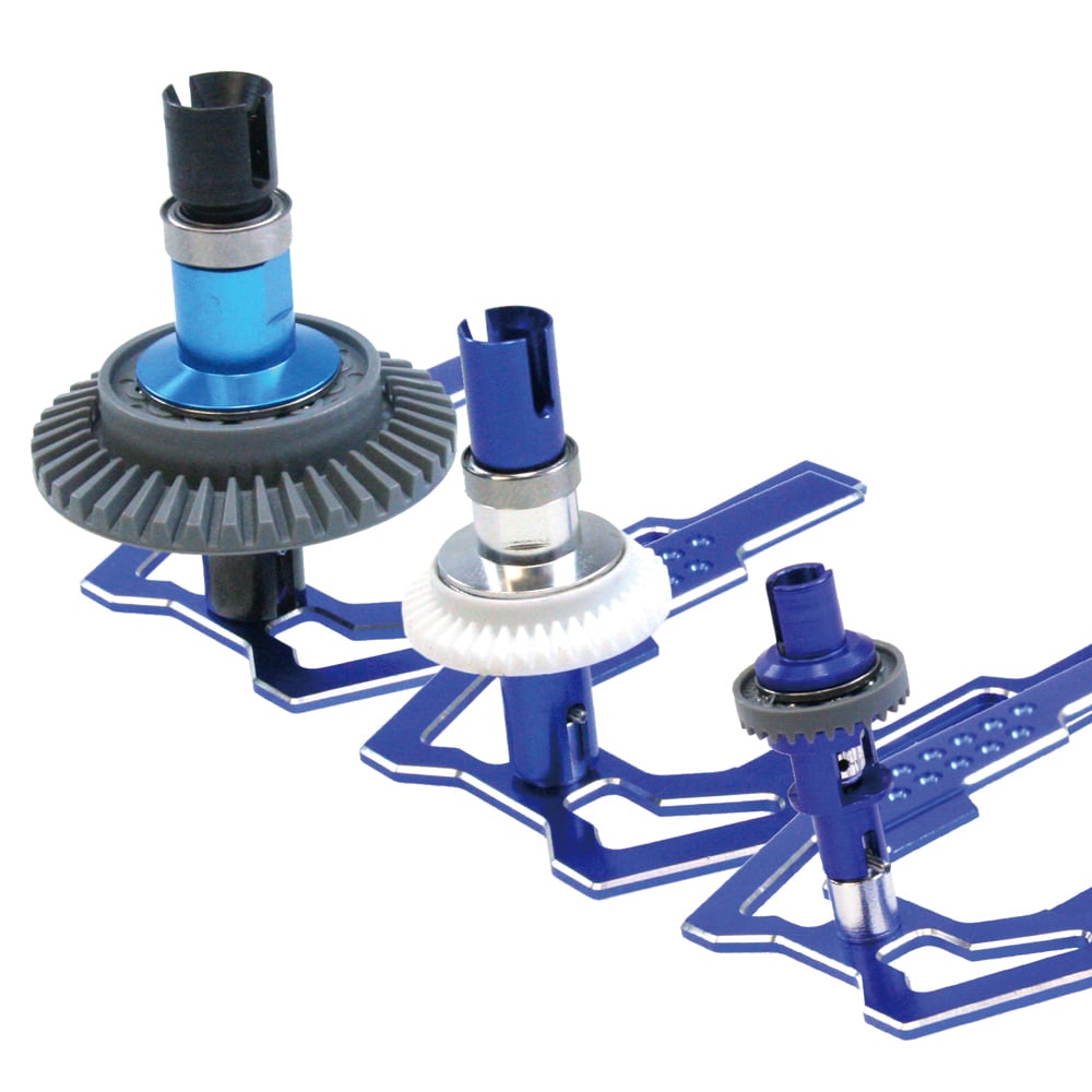 ボールデフを組み立てたり、効き調整をする為のセットアッププレートです。1/10ツーリング、1/10Mシャーシ、ミニインファーノ、ミニッツAWD等の各種ボールデフに対応するデザインとなっております。セットアップスタンドの側面は、調整中にデフボールや各種ワッシャー等をおいておけるパーツトレイ形状になっています。アクスルポストも各種サイズのデフに対応する形状になっています。