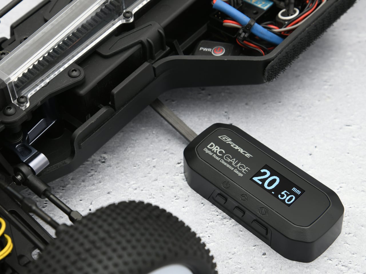高精度センサーにより、RCカーの車高を瞬時に測定可能なデジタル車高ゲージ