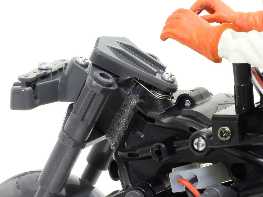 ボディはポリカーボネート製。デザインはタミヤニュースなどでおなじみのイラストレーター有野篤さんが担当。(2枚目)フラットな面が多いボディはカラフルなオリジナル塗装が楽しみ。(3枚目)シャーシは、RCメカやバッテリーを搭載したフロントセクション、モーターとギヤボックスを一体化したリヤセクションで構成。(4枚目)サーボがリヤセクションを動かす反作用で、フロントセクションが左右にロール。(5枚目)フォークヘッドにスプリングを内蔵して低速走行時の直進安定性も十分。ヘッドライトとして別売のLEDライトの装着が可能。(6枚目)コイルスプリングを内蔵したテレスコピックタイプのフロントサスペンション。(7枚目)ロール軸で連結されたリヤセクション。コイルスプリングを内蔵したカムスライド・サスペンションを装備。(8枚目)走行用電源として使える単3形乾電池用のバッテリーケースをセット。(9枚目)電池ケースはシャーシの最も低い位置に搭載。シャーシ下のカバーを開閉して電池交換も手軽。(10枚目)サーボの動きと連動して起き上がり動作を助けるサポートアーム。(11枚目)ボディホルダーをかねるサイドガードは、転倒時のボディの破損を防止。(12枚目)トランスポンダーなどが搭載できるサブデッキを用意。ライダー人形も楽しさたっぷり。(13枚目)