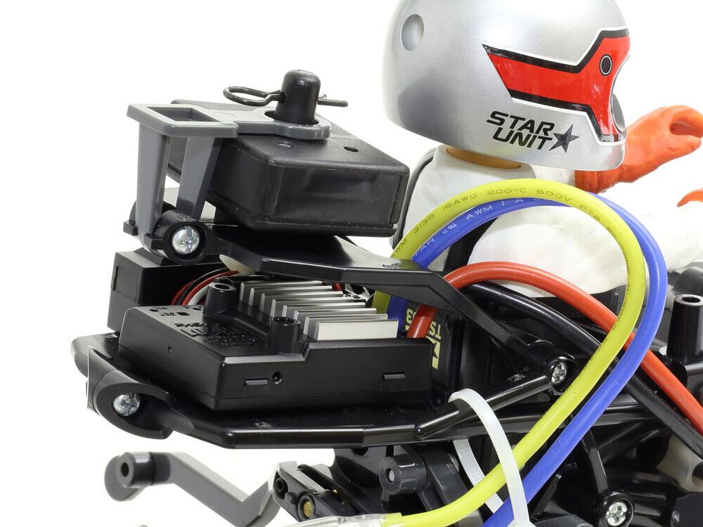 【 自力で起き上がる機能を搭載した3輪シャーシ、T3-01を採用 】 新感覚の走りを生み出すシャーシは新開発のT3-01。RCメカやバッテリーを搭載したフロントセクション、モーターとギヤボックスを一体化したリヤセクションで構成され、前後のセクションを回転するロール軸で連結。フロントセクションに搭載したサーボの動きをリンクで伝え、リヤセクションを動かす反作用で、フロントセクションを左右に傾ける動きを生み出します。自力で起き上がる注目の機構は、コーナリング用サーボに取り付けられたサポートアームがポイント。転倒した時、サーボの動きと連動したサポートアームが動くことで車体の重心位置が変わり、車体が立ち上がります。操作は、倒れた方向にステアリングホイールをいっぱいまで回すだけ。立ち上がる動作も楽しく、コーナリングと合わせて、その操作にきっと夢中になるでしょう。サスペンションは、フロントがバイクらしい形状と機能を持たせたテレスコピックタイプ。リヤはコンパクトなレイアウトの中にサスペンションとダンパー機能を盛り込んだ「カムスライド・サスペンション」を装備。リヤアクスルには旋回性を高める「プラネタリーデフ」を内蔵して、狭い室内でも軽快な走りが楽しめます。