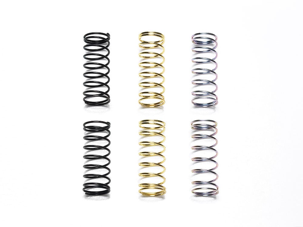 【 RCカーの性能アップやセッティングに役立つパーツです 】 ソフト(黒)、ミディアム(金・キット標準)、ハード(銀)の3種の硬さのスプリングを2本ずつセット。サスペンションセッティングの幅を広げます。