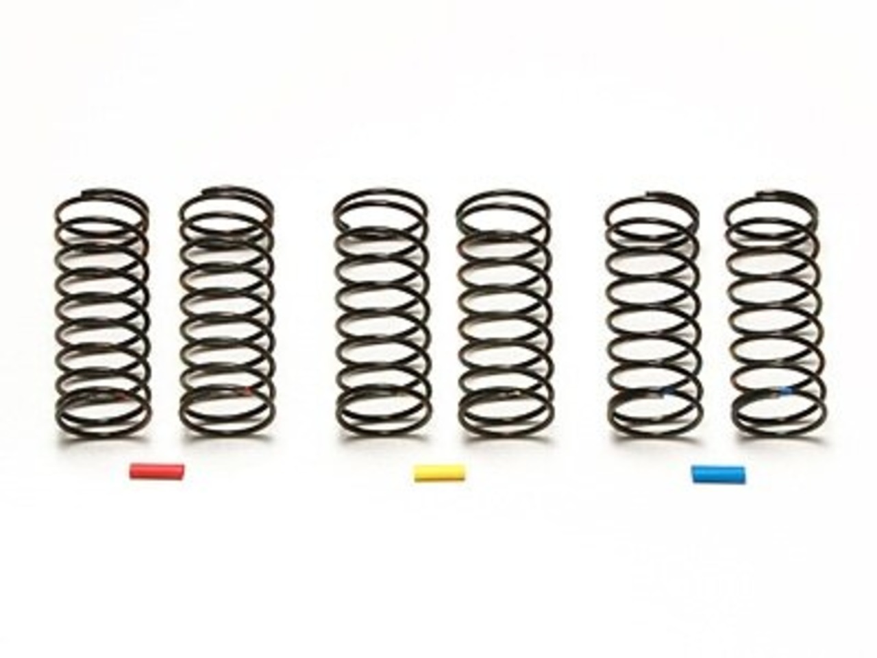 ソフト(赤印)、ミディアム(黄印)、ハード(青印)の3種を2本ずつセットしてセッティングが可能。ビッグボアARダンパーに使用する4WDバギー用のフロントスプリングセットです。識別用カラーチューブ付き。