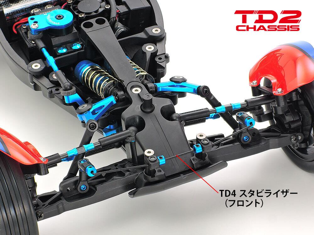 【 基本スペック 】 2種類の硬さの前後スタビロッドをはじめ、5mmアルミ六角ピロボール(ブルー)や5mmアジャスター、アルミスタビライザーエンド(ブルー)、3mmイモネジなどもセット。