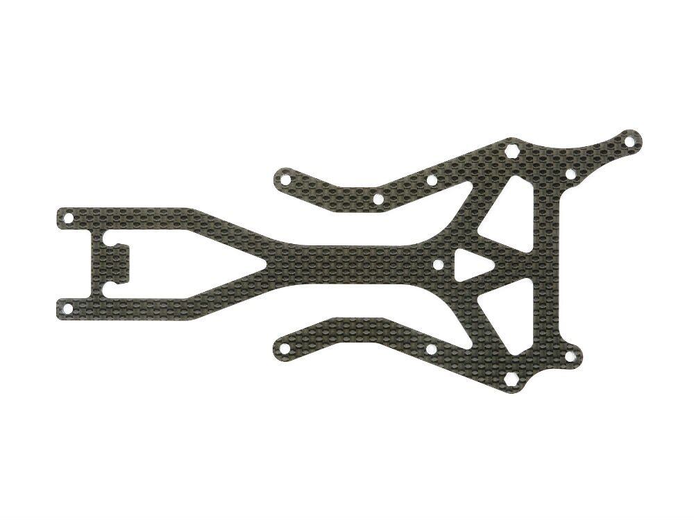 キット標準装備のFRP製分割式アッパーデッキに換えて使用する2mm厚カーボン製アッパーデッキです。フロント部分をサーボマウントと連結させてピッチング方向の剛性を高め、独特のカット加工によりロール方向は最適なしなりを発生。アッパーデッキとロワデッキがそれぞれ2種類揃い、路面やタイヤに合わせたシャーシセッティングが楽しめます。