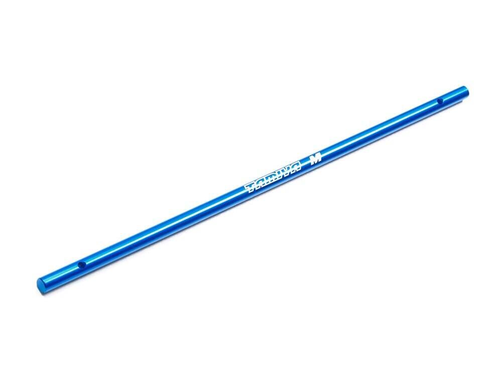 MF-01 XシャーシのMホイールベース(225mm)用のアルミ製プロペラシャフトです。キット標準のスチール製シャフトに換えて使用。回転部分を軽量化することで加減速の反応がシャープになります。ブルーアルマイト加工し、TAMIYAの文字をレーザー彫刻しました。