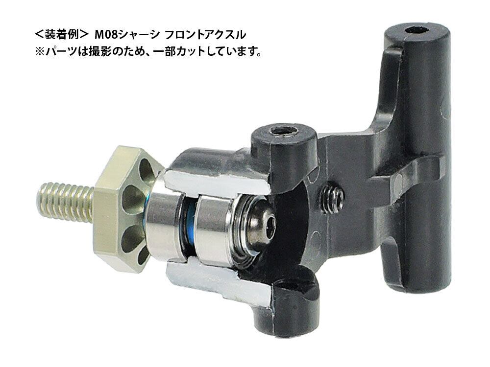 【 RCカーの性能アップやセッティングに役立つパーツです 】 ホイールハブとアクスルを一体化したアルミ切削部品。超々ジュラルミンにハードアルマイト加工を施しました。キット標準アクスルと5mmアルミ六角ハブに対して、約半分の重量。軽量化によるばね下重量の低減に大きな効果を発揮します。さらに、スペーサーの組み替えでトレッド変更も可能(M-07、M-08シャーシ)。