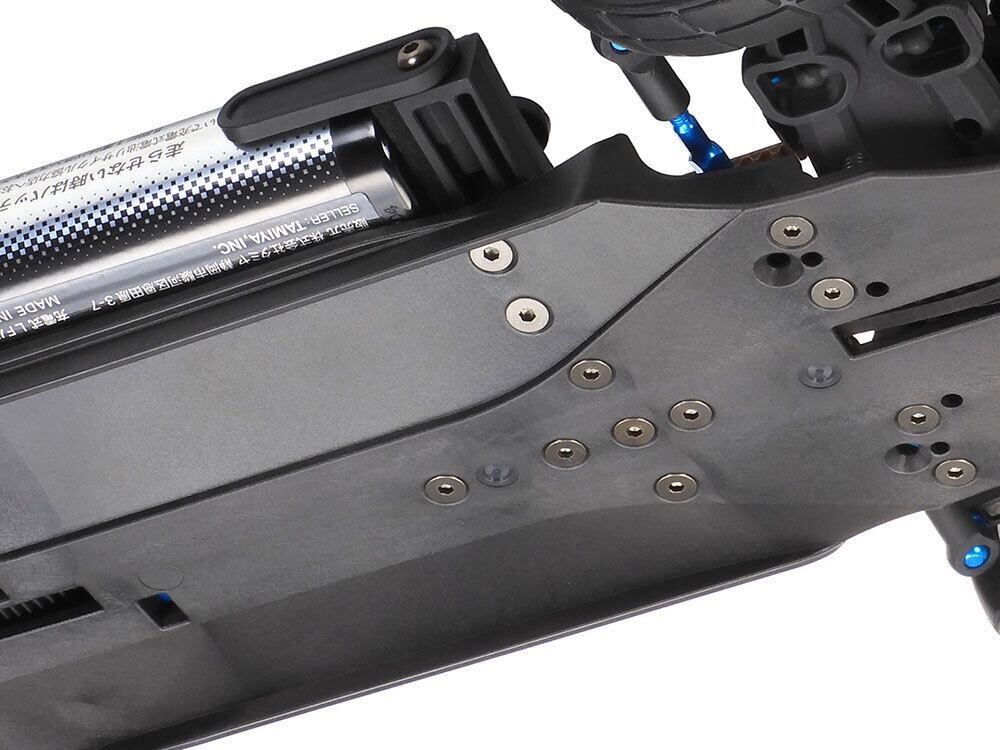 バッテリーやRCメカを傾けて搭載。シャーシ全体の高さ/幅/重量を低く抑えるだけでなく、適切なピッチング(縦方向)とロール(横方向)剛性を実現。